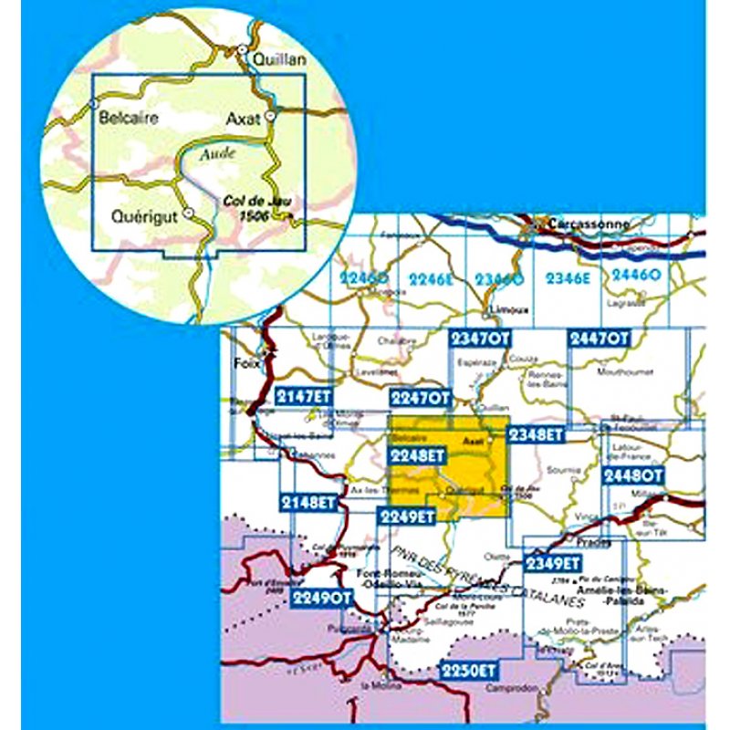 La carte de randonnée 2248ET couvre en totalité les communes de Axat, Belvianes-et-Cavirac, Quérigut, Rodome, Roquefort-de-Sault, Escouloubre, Feuilla, Rouze, Baillestavy, Artigues, Bessède-de-Sault, Carcanières, Aunat, Le Bousquet, Counozouls, Galinagues, Le Clat, Marsa, Le Puch, Campagna-de-Sault, La Fajolle et Fontanès-de-Sault.