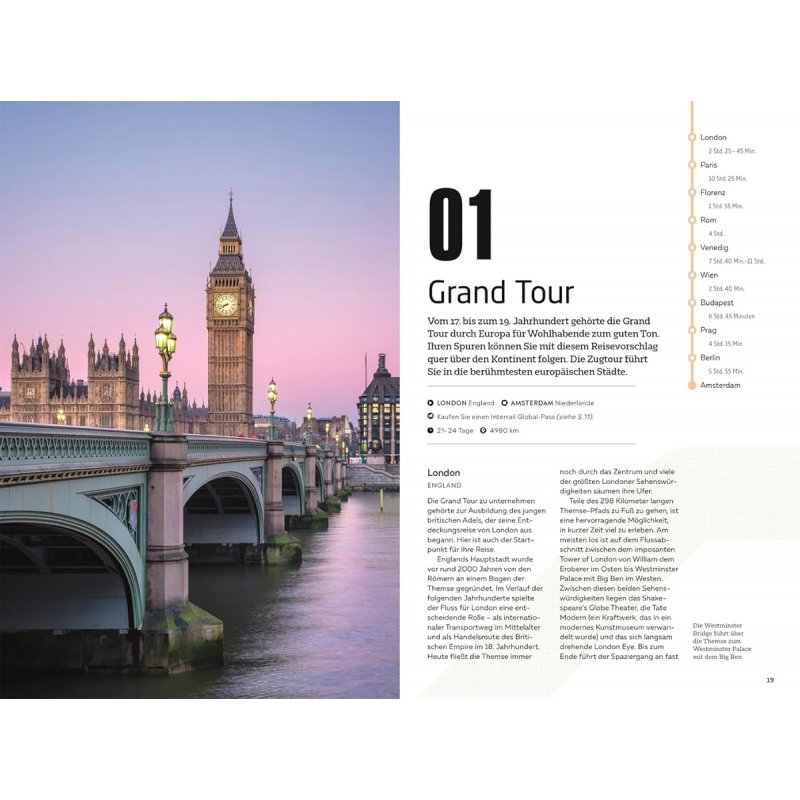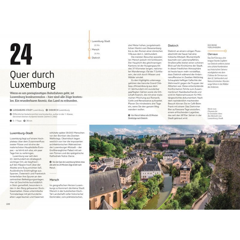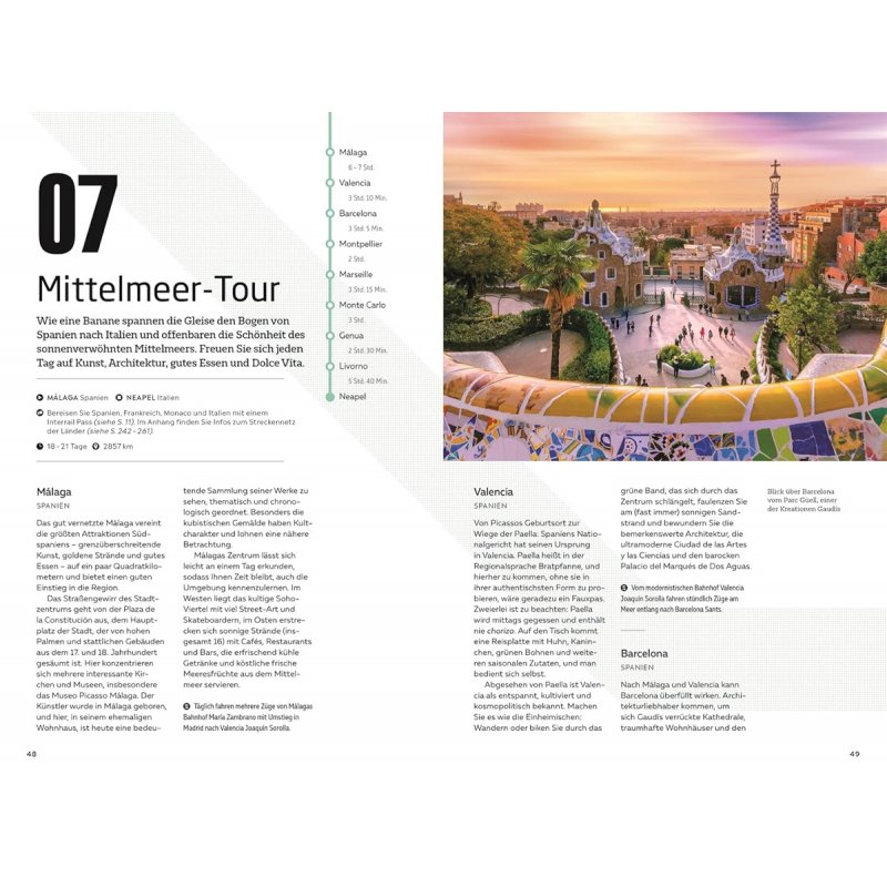 Entspannt und klimafreundlich unterwegs auf Europas gut ausgebautem Schienennetz: Die 50 Zugtouren in diesem Reiseführer führen Sie zu den schönsten Städten innerhalb Europas - und das ganz ohne Flieger! Ob quer durch den Kontinent in mehreren Wochen oder von Strand zu Strand in wenigen Tagen, ob günstig mit dem Interrail-Ticket oder als spektakuläre Reise in einzigartigen Zügen wie dem Glacier Express: Die ausgewählten Zugstrecken haben für jedes Reiseziel die passende Tour im Gepäck!