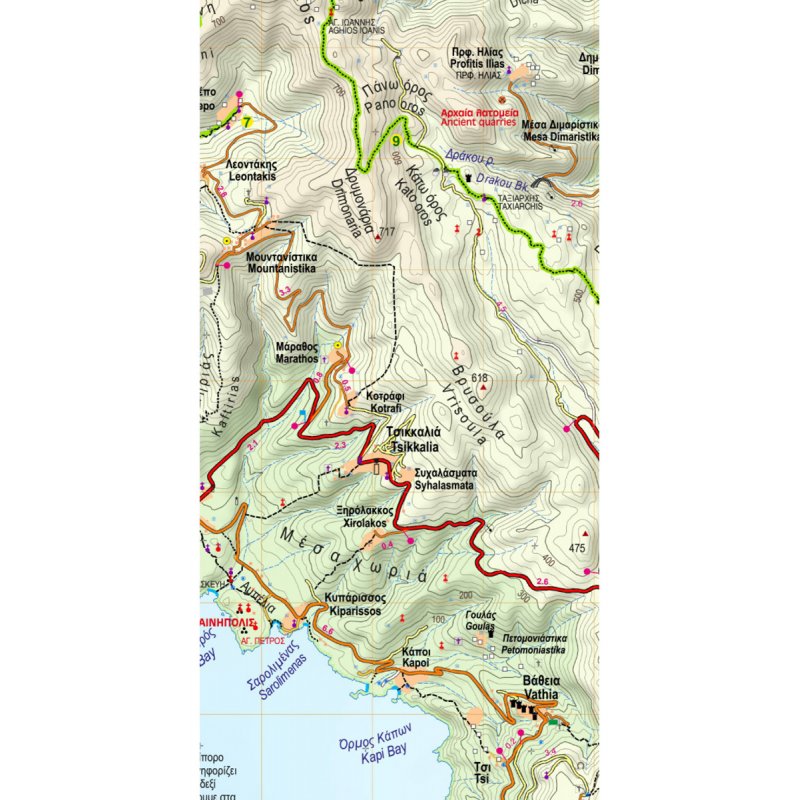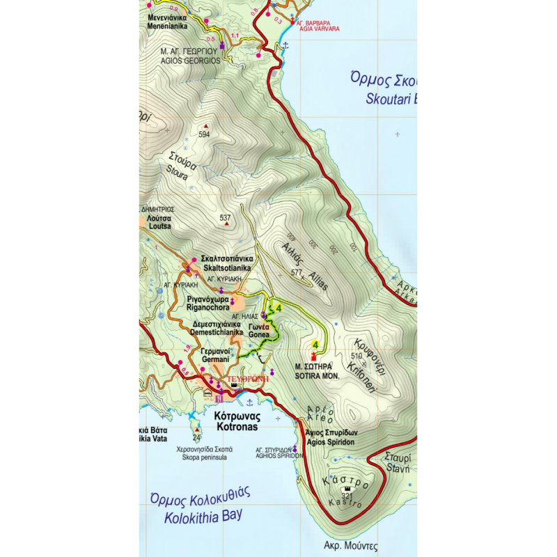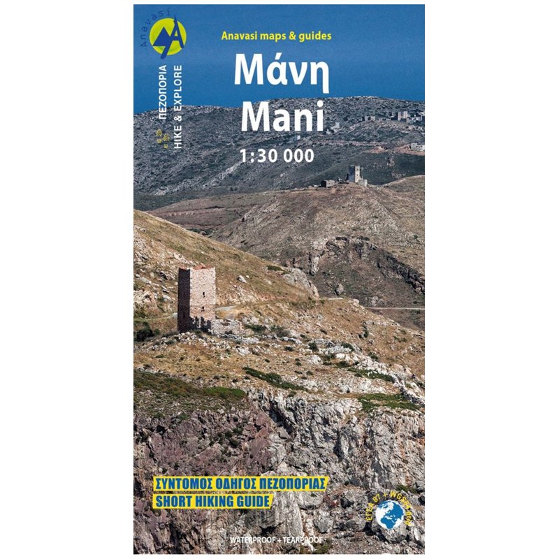 Wanderkarte von Mani im Maßstab 1:30 000. Die Karte führt Sie durch den trockenen Teil der Halbinsel, der als "Mesa Mani" bekannt ist, bis zum Kap Tenaro oder Cabo Matapa. Eine unvergessliche Wanderung zum südlichsten Punkt des Peloponnes, der in der Antike als Tor zur Unterwelt galt. Plutarch und Pausanias berichten von einer kleinen Höhle, die als Totentempel diente.