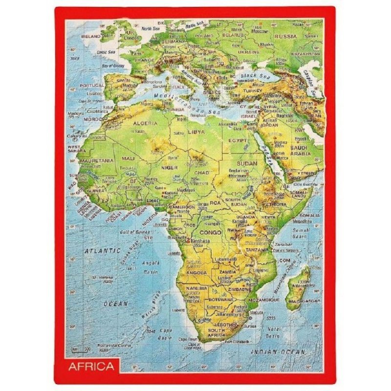 Auf der Bildseite befindet sich eine Afrikakarte mit ''Hubbeln'' zum Fühlen und anschaulichem Erkennen der Höhenreliefs des Landes.