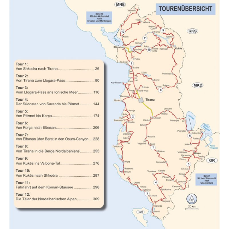 Folgen Sie uns auf 12 sorgfältig recherchierten Touren durch die schönsten und interssantesten Regionen Albaniens. Orientieren Sie sich an den Übersichtskarten zu allen Sehenswürdigkeiten, den Stell- und Campingplätzen und den empfohlenen Reiserouten.