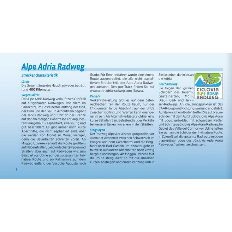 Der Alpe Adria Radweg verläuft zum Großteil auf ausgebauten Radwegen, vor allem im Salzachtal, im Gasteinertal, entlang der Möll, der Drau und der Gail. In Arnoldstein beginnt der Tarvis Radweg und führt ab der Grenze auf der ehemaligen Bahntrasse entlang, bestens ausgebaut - asphaltiert, zweispurig und gut beschildert. Es gibt immer noch kurze Abschnitte, die nicht asphaltiert sind, aber die werden von Monat zu Monat weniger, denn die Bauarbeiten schreiten voran. Ab Moggio Udinese verläuft die Route großteils auf Nebenstraßen, Landwirtschaftswegen und Straßen, aber auch auf Radwegen wie zum Beispiel vor Udine auf der sogenannten ln@natura Route und ab Palmanova auf dem Radweg entlang der Via Julia Augusta nach Grado.