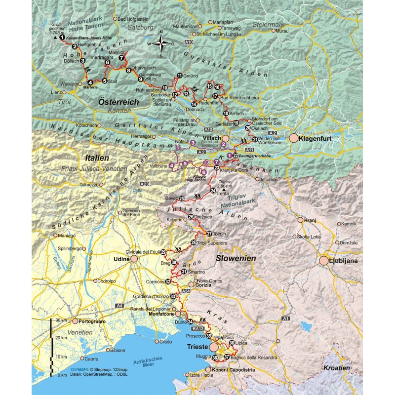Von den Bergen bis ans Meer: Der Alpe-Adria-Trail macht es möglich. Auf rund 707 km führt der Weitwanderweg durch Kärnten, Slowenien und Friaul-Julisch Venetien. Beeindruckende Gebirgsformen und zahlreiche geschichtliche Zeugnisse lassen die Wanderung nie langweilig werden. Darüber hinaus begeistern die Gastfreundschaft der Einheimischen und die vielfältige Küche der verschiedenen Regionen. Der Wanderführer beschreibt den Weg vom Großglockner nach Muggia an der Adria in 37 Etappen. Zu jeder Tagesetappe finden Sie hilfreiche Angaben zu Übernachtungsmöglichkeiten und anderer Infrastruktur vor Ort. Bei der Orientierung helfen genaue Karten, Höhenprofile und kostenlose GPS-Tracks.