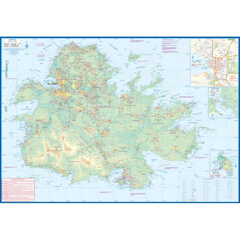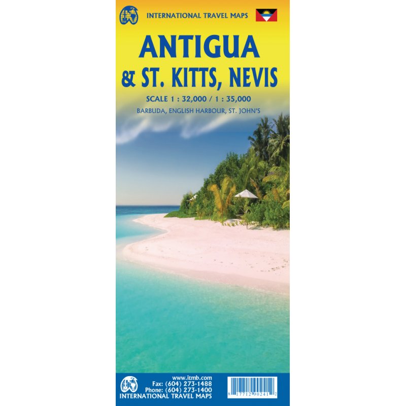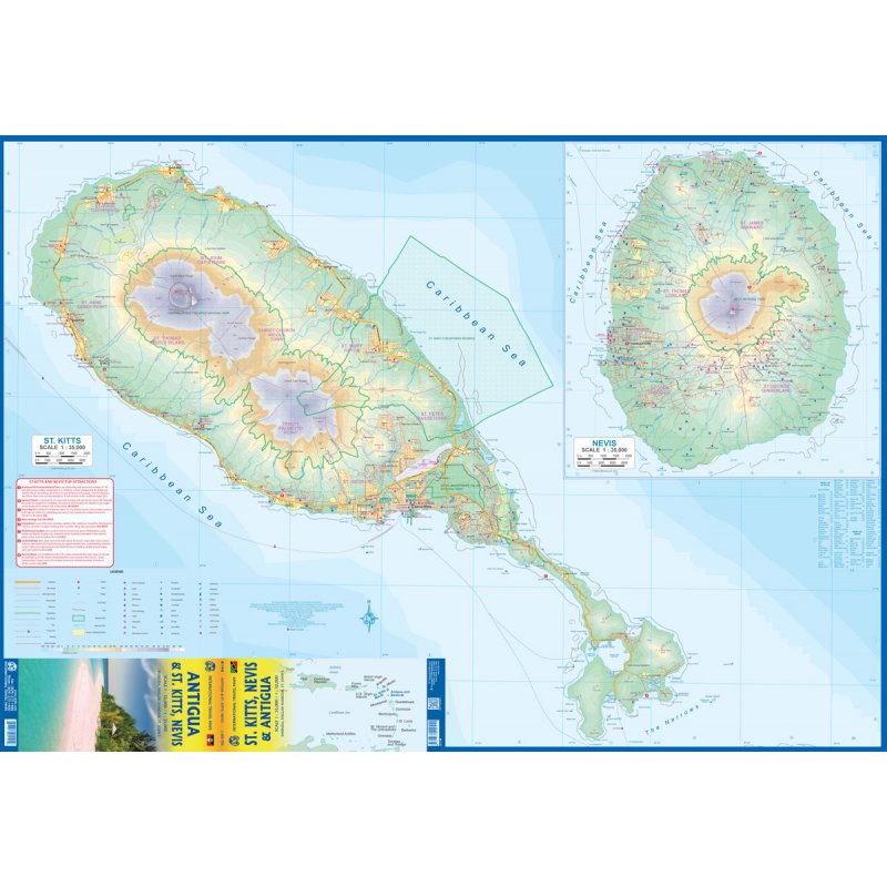 Description by ITMB: Our latest version of Antigua is also a new title for ITMB, in that we are combining the Caribbean island nation with nearby St. Kitts and Nevis, with a small inset map for the lovely island of Barbuda. Side 1 is a very expansive and detailed map of Antigua, with a good inset map of St. John’s, the capital. At the southern end of the island is Nelson’s Dockyard, a historical remnant that serviced British naval ships for centuries, and is well-worth a visit.