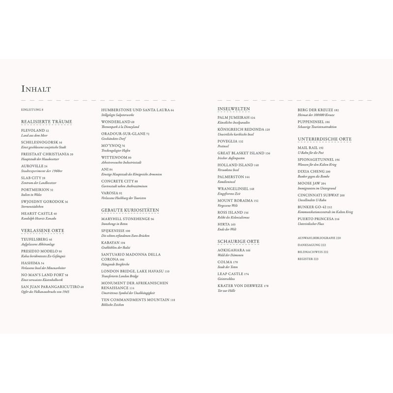 Die Welt ist voller seltsamer und geheimnisvoller Orte: dem Meer abgetrotzte Landstriche, verlassene Inseln, unterirdische Labyrinthe, rätselhafte Ruinen voller Geschichte und Geschichten, eine Stadt, die vollständig unter Lava begraben ist, ein Fantasiepalast, errichtet aus Versatzstücken europäischer Architekturen, ein irisches Schloss, in dem es Tag und Nacht spukt. Travis Elborough, Kulturjournalist und Weltreisender mit einem Blick für das Ungewöhnliche, ja Unmögliche, hat die unwahrscheinlichsten Plätze der Welt erkundet und sie in einen Atlas des Staunens eingeschrieben. Er nimmt uns mit auf seine Reise zu verwaisten Städten, unerhörten Plätzen und abgelegenen Winkeln, erzählt ihre Geschichte und entführt uns Leser zu Orten, die unseren kühnsten Träumen entsprungen sein könnten.
