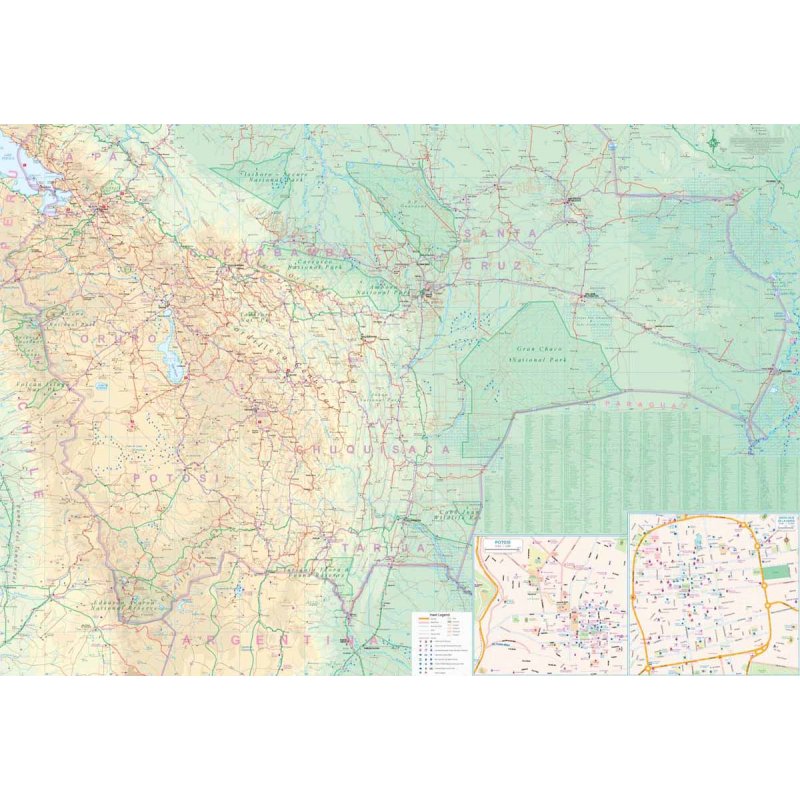 South America retains its attraction as an exotic travel destination, and land-bound Bolivia is one of its great adventures. This double-sided map shows the country to good advantage. The western half is mountainous and is where the bulk of the local people live. Side 1 includes inset maps of Potosi and Santa Cruz de la Sierra, two colonial cities of interest. The other side of the sheet shows the more northerly grasslands pampas leading to Brazil and Peru and has an inset map of La Paz, the county’s capital. The country is most easily reached by land from Peru by Hwy 3 along the south shore of Lake Titicaca, or from Argentina by Hwy 9, going north from Salta. Connections from Brazil and from Chile are possible, but not as well used. There is only one road connecting the country to neighbouring Paraguay, so Bolivia remains one of those off-the-beaten-track travel experiences beloved of jaded travellers.