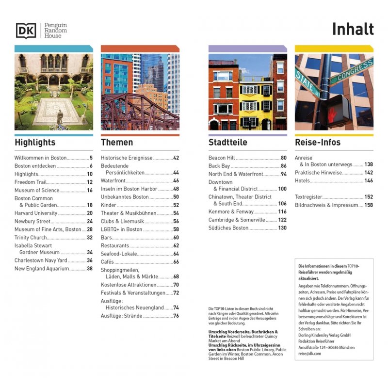 Spazieren Sie entlang der eleganten Reihenhäuser und noblen Antiquitäten-Shops in Beacon Hill, bewundern Sie die Kunst- und Kulturszene im viktorianischen Back Bay oder machen Sie einen Abstecher ins historische Neuengland oder an einen Strand in der Umgebung - im TOP10 Boston-Reiseführer werden die einzelnen Stadtteile und Ausflüge ins Umland Bostons übersichtlich und ausführlich porträtiert. Stimmungsvolle Fotos und detaillierte Stadtteil-Karten zeigen berühmte Sehenswürdigkeiten, charmante Stadtviertel sowie Restaurant-, Shopping- oder Tourenvorschläge auf einen Blick.