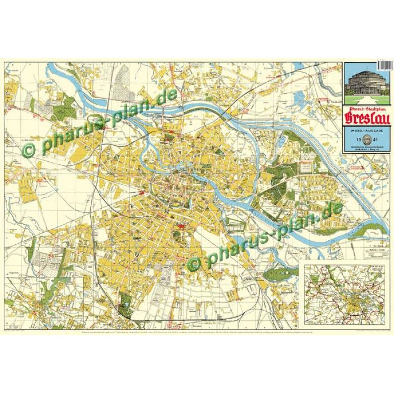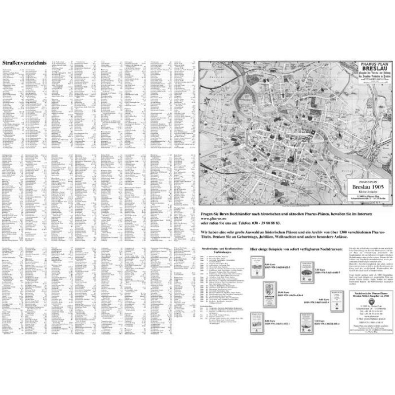 Mit einer Übersichtskarte »Groß Breslau« (1:100.000) auf der Vorderseite. Auf der Rückseite (schwarz/weiß): Historisches Straßenverzeichnis und Verzeichnis der damaligen Straßenbahn- und Kraftomnibus-Verbindungen sowie eine Karte »Breslau 1905« (Kleine Ausgabe).
