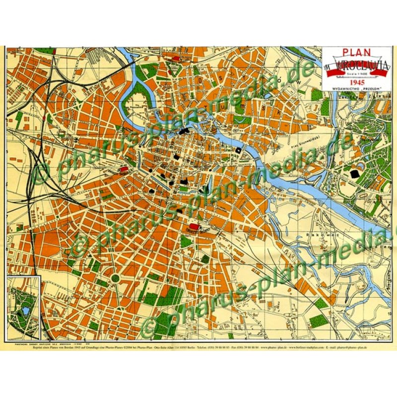 Dies war der erste Plan von Breslau bei Kriegsende, auf Basis eines der letzten Pharus-Pläne aus deutscher Zeit Breslaus. Die Beschriftungen im Kartenbild sind hier also bereits auf polnische Sprache »umgestellt« gewesen.