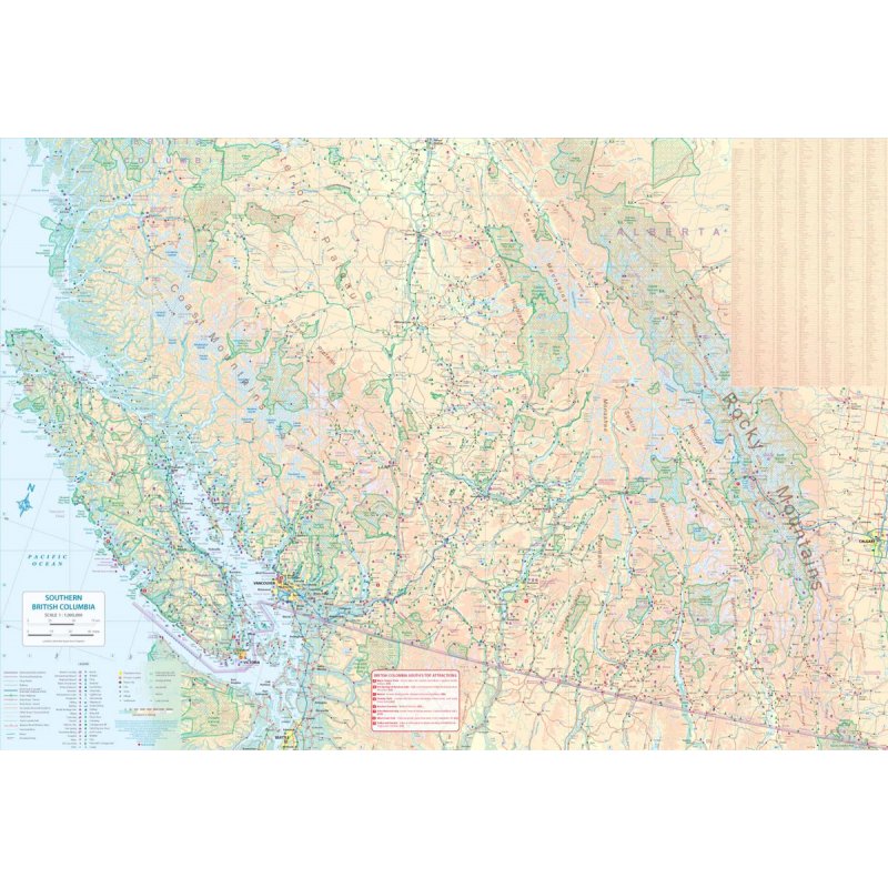 Description by ITMB: ITMB, being based in Vancouver, BC, understandably has a local/regional market for our map line. We have a map of Western Canada, as well as an atlas, a very nice map of BC itself, a map of the south half of BC, and a map of part of BC combined with Washington State. What we did not have, until now, was a map covering the most touristically-visited part of all of Canada – namely, the southern halves of both British Columbia and its neighbour, Alberta, with a small amount of Washington State, Idaho, and Montana (to assist those heading north and needing to know about border crossings). Therefore, ITMB is pleased to announce the release of Southern BC and Alberta. Side One covers BC from the US border (with a carry-on to Seattle) north to Prince George and east to the Alberta border, with a carry-on to Calgary. All of Vancouver Island, the Okanagan Valley, and the Rock Mountain National Parks of Banff and Jasper, are included. The map is rich with wilderness campsite (almost 1,000 are shown, ski areas, fishing areas, even gas stations in more remote parts of the vast province. Side Two covers Alberta from somewhat north of Edmonton (the provincial capital) to the American border and a bit beyond, and from the Rocky Mountains east to a bit beyond the Saskatchewan border. This side focusses on the movement from the high Rockies to the foothills and plains of the enormous Canadian Prairies The highlights of this side of the map are showcased in our Top Attractions guide and include such world-class features as the Drumheller Dinosaur Museum, the world's best, to the Columbia Icefield, one of the few in the world easily accessible to walk on. Naturally, the road network, train lines, urban areas, parks, and numerous attractions (who could pass up visiting Head-Smashed-In Buffalo Jump?)are all clearly shown.