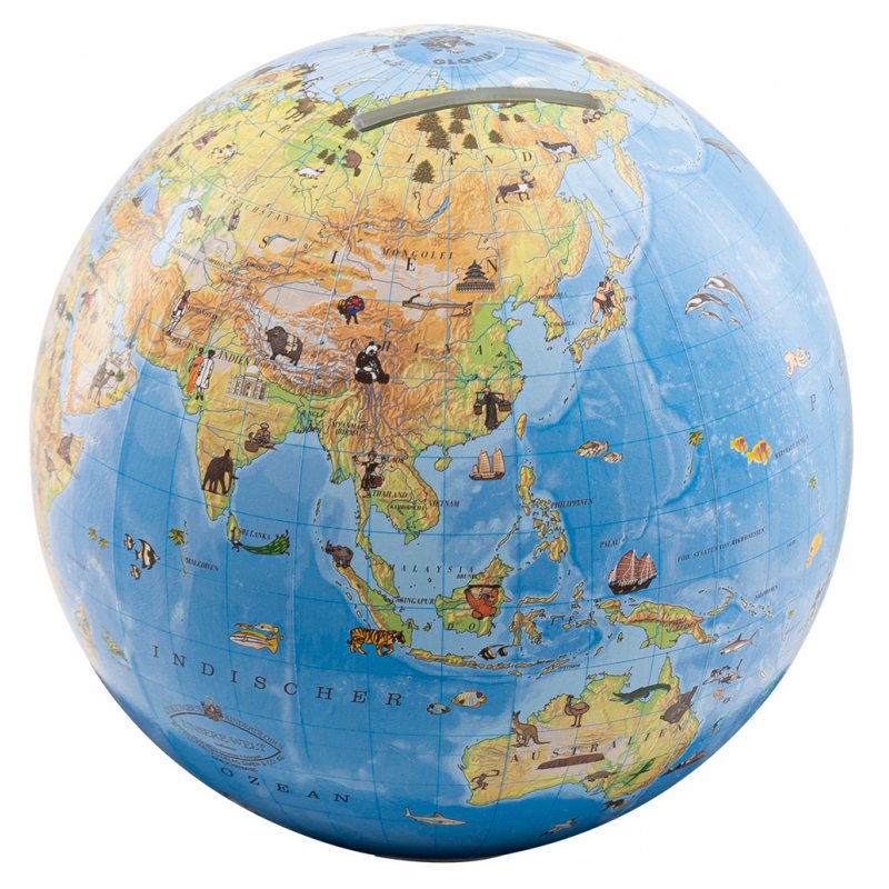 Diese Spardose zeigt das kindlich ansprechende Kartenbild "Unsere Erde", das mit farbenfrohen Tierabbildungen und einer Vielzahl an landestypischen Grafiken einen kleinen Einblick rund um unsere Welt vermittelt.