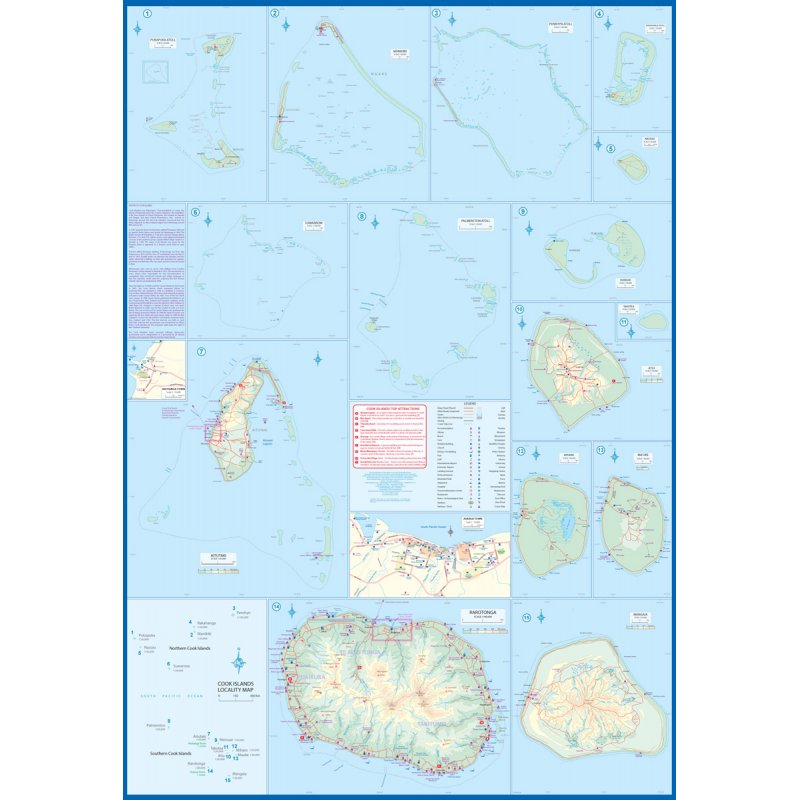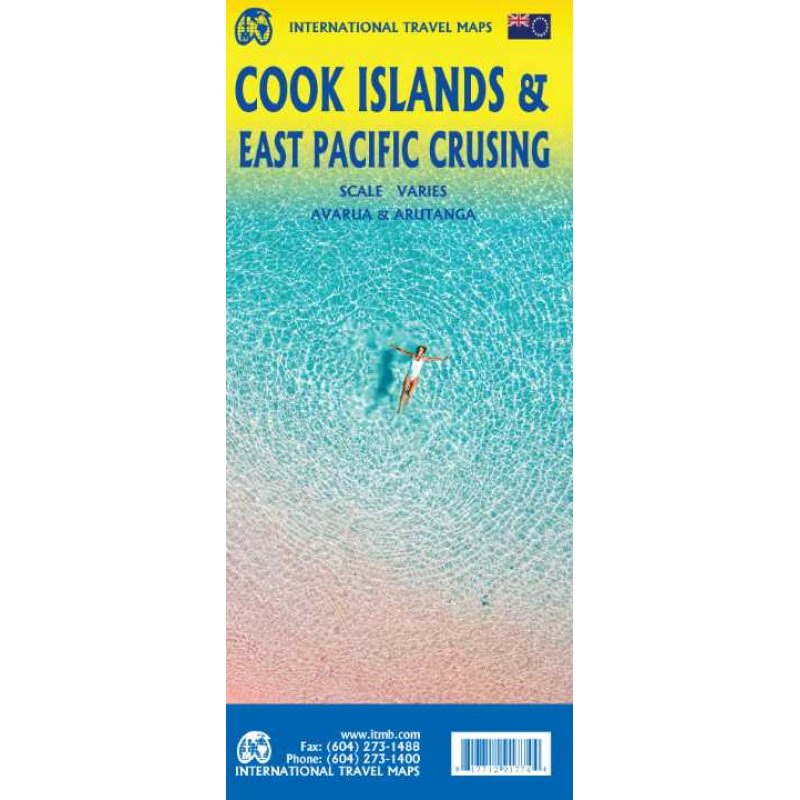 Description by ITMB: This is a combination map, focused on two travel realities. Side 1 is a detailed map of the main islands making up the Cook Island archipelago. To provide more detail, the country is an inset map in the lower left corner, with numbers in blue, up to 15. The main map on Side 1 is a series of inset maps providing excellent detail of individual islands, such as Raratonga, Mangaia, or Aitutaki, or island groupings of more northerly groupings that are little more than atolls, such as Penrhyn or Palmerston. The capital is Avarua, and an inset map is included; also one of Arutanga on Aitutaki. The country is well-positioned for tourism, and has many resorts, particularly on Raratonga. Side 2 is a new map for ITMB, part of our growing Cruising line. This on covers the eastern portion of the South Pacific, from the Marshall Islands, Nauru, and the Solomons on the west to Hawaii and Tahiti on the east, and as far south as New Zealand. Other island nations included on this map are Kiribati, Tuvalu, Fiji, Samoa, and New Caledonia. By the nature of portraying a vast ocean, little detail of each island can be provided. The purpose of this map is to show routes followed by ships visiting the overall region. This is a rapidly-growing travel area for major cruise lines, and promises to be as attractive in the future as cruises in the Caribbean or Mediterranean. This region holds great prospects for the future. Besides, it is a lovely map to look at.