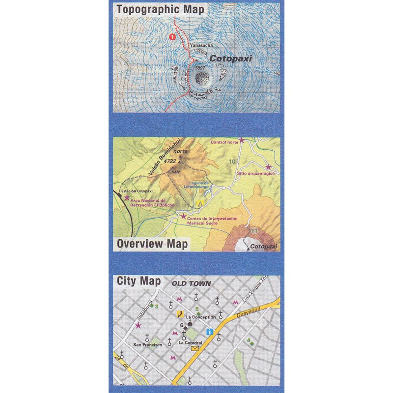 - Topografische Bergsteigerkarte, Stadtplan Quito, Übersichtskarte 1:250'000, Avenida de los Volcanes, Krokis 5 weiterer Vulkane, Routenbeschreibungen, Vegetationsprofil, Klimadiagramm, GPS-Informationen.