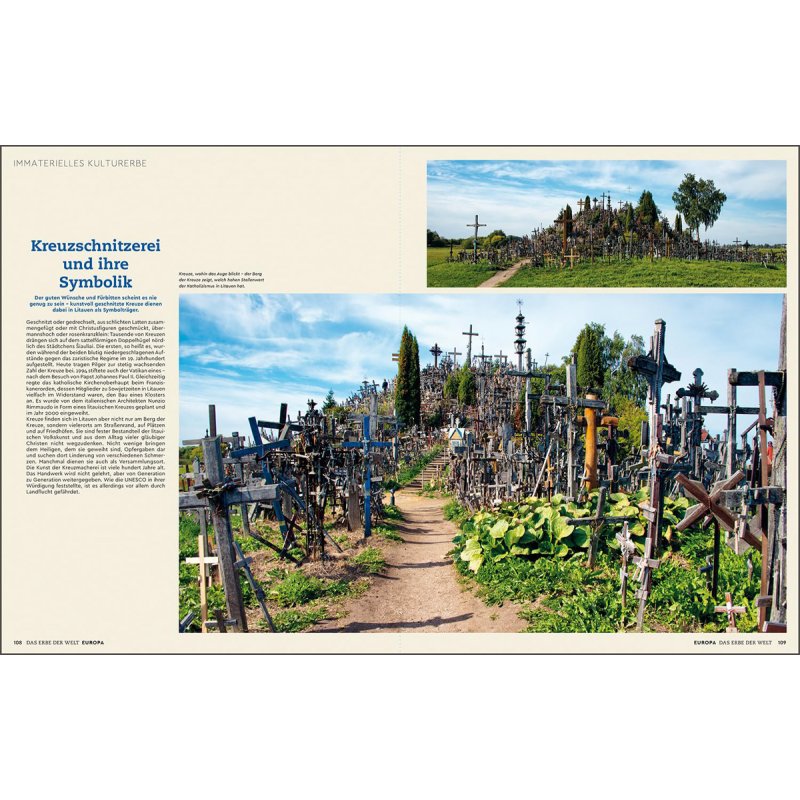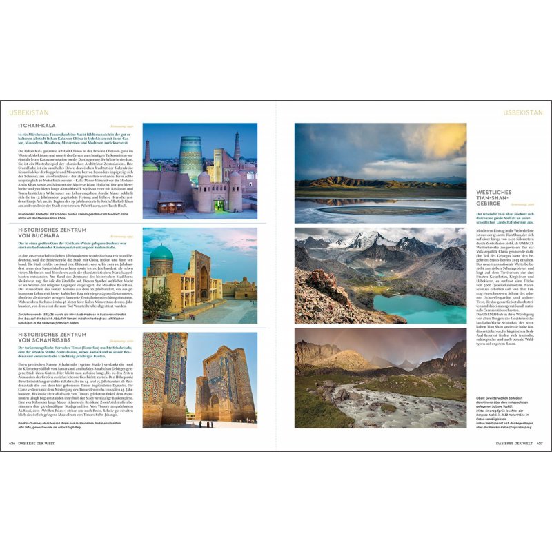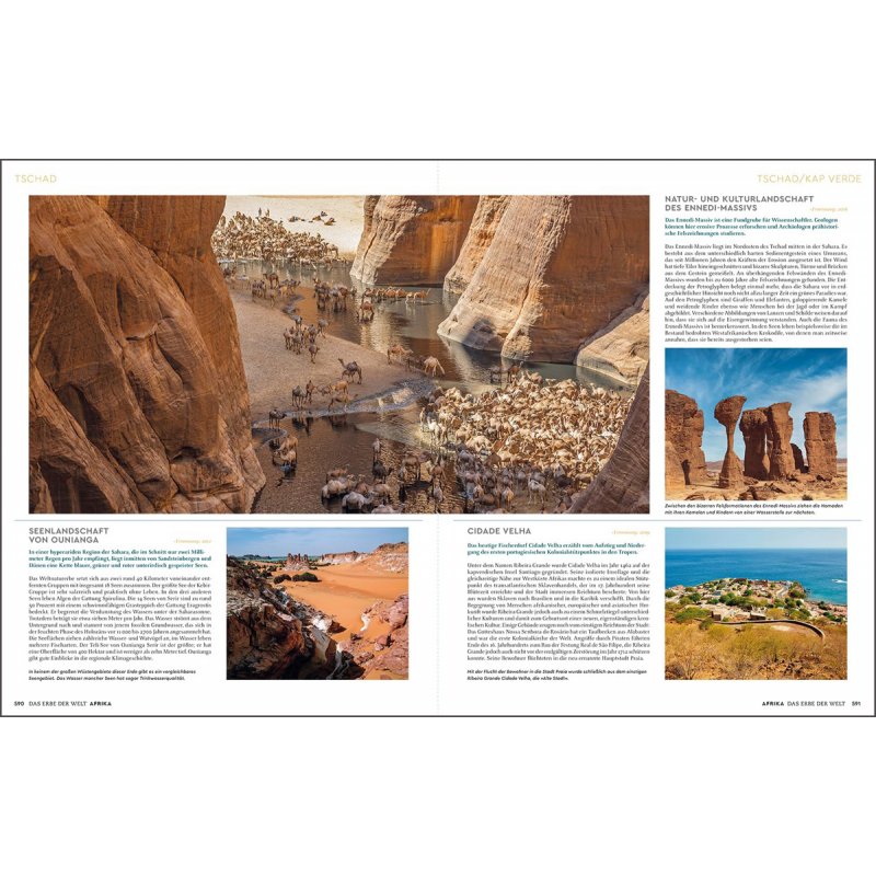 Der KUNTH-Bildband „Das Erbe der Welt 2024/25“ führt nach Kontinenten gegliedert sämtliche Stätten mit fantastischen Fotos und informativen Texten auf. Zwischen den einzelnen Welterbestätten sind interessante Seiten zum Immateriellen Kulturerbe eingebunden, die einen Blick auf Traditionen und Brauchtum einzelner Länder und Völker werfen.