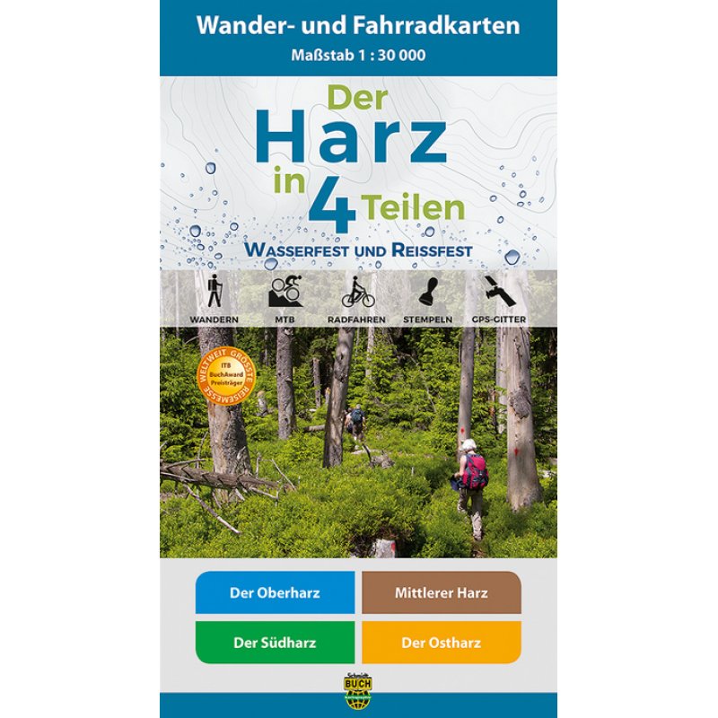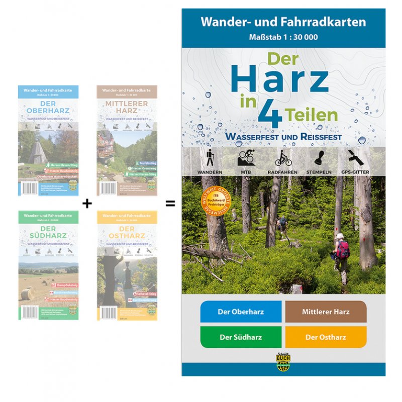 Das Karten-Set „Der Harz in 4 Teilen“ vereint die Wander- und Fahrradkarten „Der Oberharz“ „Mittlerer Harz“, „Der Ostharz“ und „Der Südharz“ zu einem praktischen Komplettpaket für den gesamten Harz. Egal ob man anspruchsvolle oder eher erholsame Wandertouren unternehmen, anstrengende Mountainbike- oder eher entspannende Trekkingrouten abfahren möchte, die vier detailreichen Karten sind immer die idealen Begleiter.