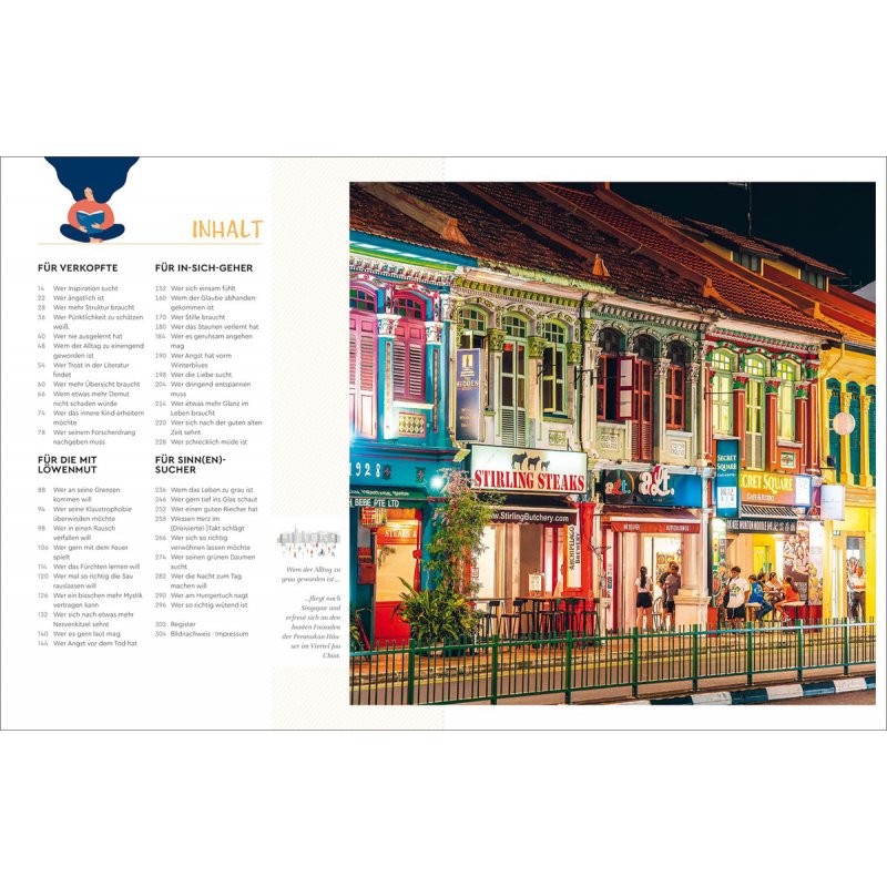 Dieses KUNTH-Reisebuch „Der kleine Reise-Therapeut“ bietet für jeden das Richtige: Das Leben ist zu grau? Ab ins farbenfrohe Burano! Sie wollen sich mal richtig gruseln? Einmal im Spukschloss in Nordirland übernachten! Sie benötigen Inspiration? Wie wäre es mit der Einsamkeit finnischer Wälder? Sie wollen was fürs Herz? Auf zu den glücklichsten Menschen nach Bhutan! Für jede Lebenslage gibt es ihn: den einen Ort, der glücklich macht.