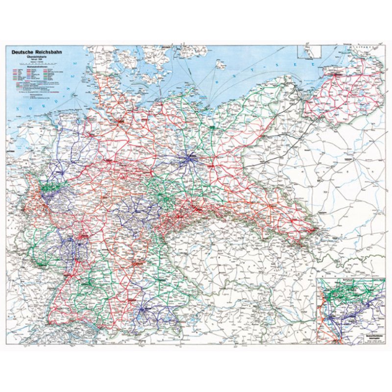 Titel: «DEUTSCHE REICHSBAHN - ÜBERSICHTSKARTE FEBRUAR 1938» erschien im Februar 1938 im Maßstab 1 : 500 000.Titel: «DEUTSCHE REICHSBAHN - ÜBERSICHTSKARTE FEBRUAR 1938» erschien im Februar 1938 im Maßstab 1 : 500 000. Der Reprint durch den Verlag Rockstuhl in Originalgröße erfolgte auf der Grundlage der Auflage von 1938 der Verkehrswissenschaftliche Lehrmittelgesellschaft m.b.H., Leipzig - bearbeitet in der Kartenstelle des Reichsverkehrsministeriums Berlin, Eisenbahnabteilung.