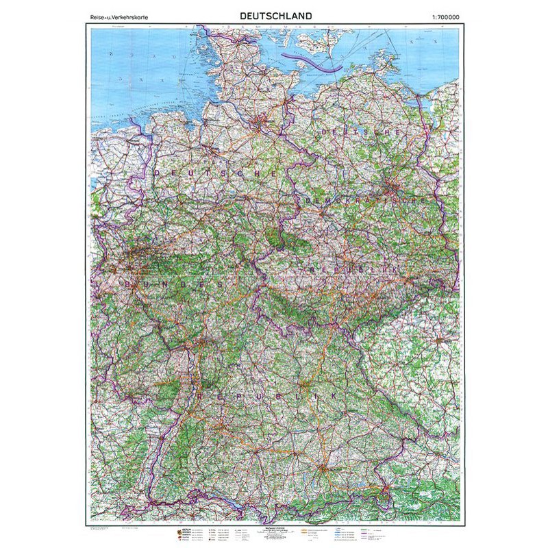 Nachdruck. Maßstab: 1:700 000. 1., Nachdruck, bearbeitet von Harald Rockstuhl Reise- und Verkehrskarte von Deutschland - Die letzte gesamtdeutsche Karte vor der Grenzschließung und Mauerbau am 13. August 1961 Aus EINEM Vorn und Hinten bedruckten Bogen, je (B x H) 98 x 69 cm.