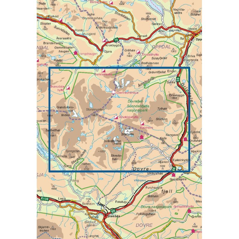 Turkart Dovrefjell - Snøhetta deckt das Gebiet vom Grøvudalen im Westen bis zum Drivdalen im Osten ab, wobei die Snøhetta im Zentrum der Karte liegt. Machen Sie einen Ausflug durch das Moschusochsenreich, hinauf durch das Stropisjødalen oder besteigen Sie die Snøhetta vom neuen Sitz des Tourismusverbandes auf dem Dovrefjell, Snøheim. Oder machen Sie eine lange Wanderung von Hütte zu Hütte tief in der Wildnis.