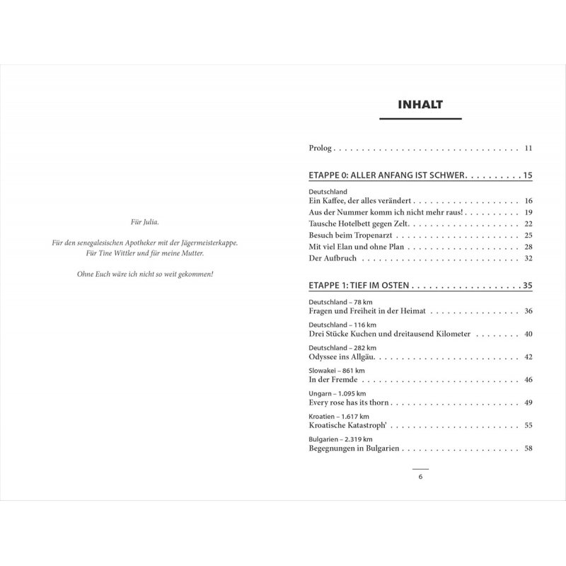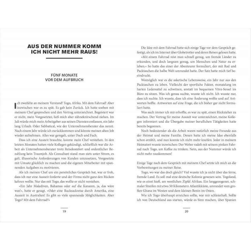 Der Unternehmensberater Markus Weber wirft seine heile Welt über den Haufen und stürzt sich Hals über Kopf in ein Abenteuer. Er setzt sich auf sein Fahrrad und fährt los – durch 26 Länder, bis nach Togo. Er fährt per Anhalter durch die Sahara, radelt durch den guineischen Regenwald und schmuggelt sich in Liberia über geschlossene Grenzübergänge. Alles, um zwei Fragen zu beantworten: Wer bin ich? Und: Gibt es eigentlich Coffee to go in Togo?