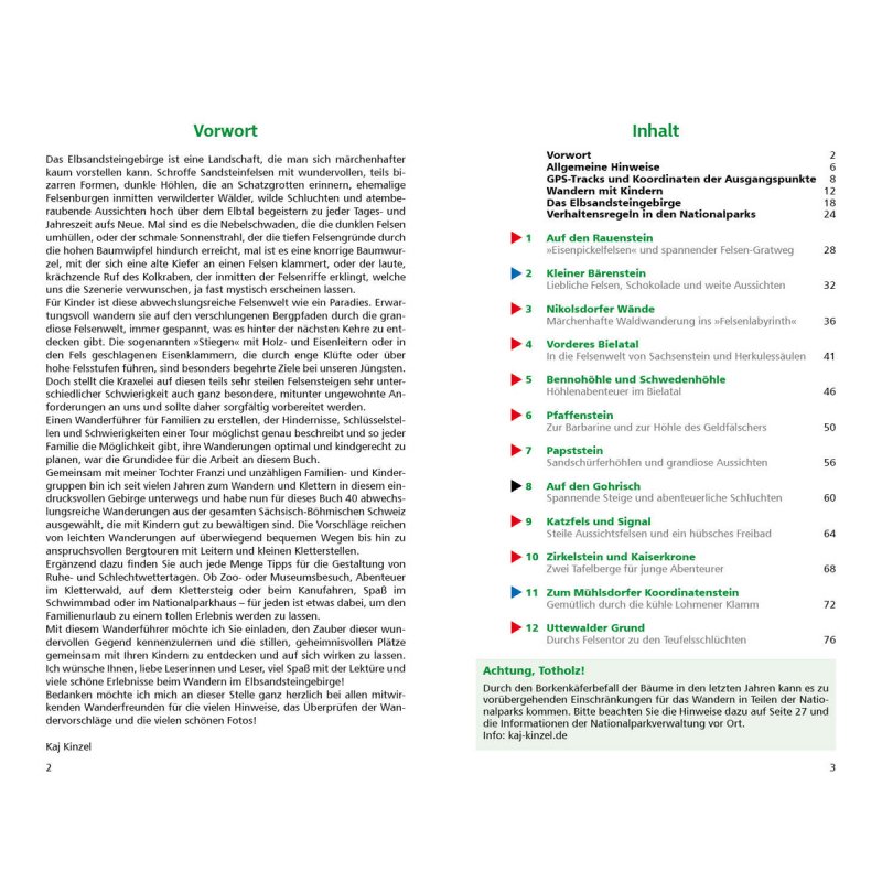 Jede der Erlebniswanderungen bietet etwas Besonderes: Mal lässt sich ein spannendes Felsenlabyrinth erkunden, mal geht es zu sagenumwobenen Höhlen. Zusätzlich liefert das Wanderbuch mehr als 70 spannende Freizeit- und Schlechtwettertipps für das Elbsandsteingebirge, vom Saurierpark über Kletterwaldabenteuer bis hin zu Freizeitparks und Freibädern. Speziell für Kinder erzählt Bubo, der weise Uhu, zu jeder Tour sagenhafte Geschichten, erklärt Naturphänomene und verrät Wissenswertes über Raubritter, Maler oder Kletterer in der Sächsischen Schweiz.