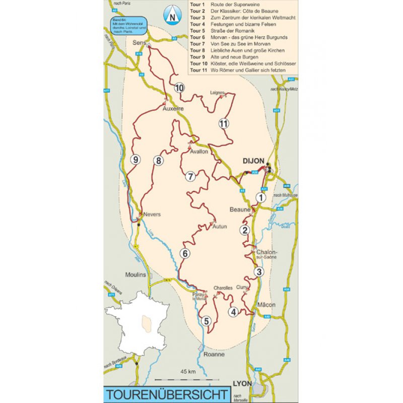 - Elf individuell recherchierte Touren führen 1825 km auf kleinen Straßen durch die herrliche, abwechslungsreiche Landschaft von Burgund, wo Touristenrummel ein Fremdwort ist.