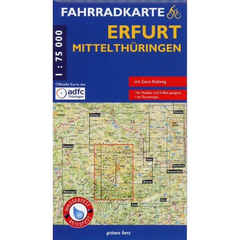 Mittelpunkt der Karte, welche in enger Zusammenarbeit mit dem ADFC Thüringen entstand, ist das Radwandergebiet rund um Erfurt bzw. Mittelthüringen. Sie reicht von Greußen und Gierstedt im Norden, Bad Langensalza und Georgenthal im Westen, sowie Kranichfeld und Kölleda im Osten bis nach Zella-Mehlis und Ilmenau im Süden. In dieser Karte werden separate Radwege und auf öffentlichen Straßen und Wegen verlaufende Radrouten, incl. dem gesamten Verlauf des Gera-Radwanderweges, dargestellt. So können Radtouristen auf einen Blick erkennen, wo Radwege das Rad fahren außerhalb des motorisierten Verkehrs erlauben bzw. wo es sich nicht vermeiden lässt, einzelne Abschnitte gemeinsam mit diesem unterwegs zu sein. Erstmals werden Fernradwege farblich besonders hervorgehoben und die Angabe von Kilometerdistanzen an den Radstrecken ermöglichen eine leichte Tourenplanung Die Oberflächenqualität der Radrouten und Radwege ist in drei Kategorien eingeteilt und dementsprechend gekennzeichnet. Außerdem sind ungeeignete bzw. verbotenen Wege und Straßen sowie Steigungen ausgewiesen. Lohnenswerte Ziele und Sehenswürdigkeiten sind mittels Symbolen gekennzeichnet und entsprechend beschriftet. Auf der Rückseite geben Text und Fotos Informationen zu den verschiedensten Regionen des Kartenausschnittes und sie hält Radroutenvorschläge mit unterschiedlichem Schwierigkeitsgrad parat. Durch die anwenderfreundliche Faltung ist es kein Problem, die Fahrradkarte auf der Lenkertasche unterzubringen. Die Karte wurde auf speziellem Landkartenpapier gedruckt.