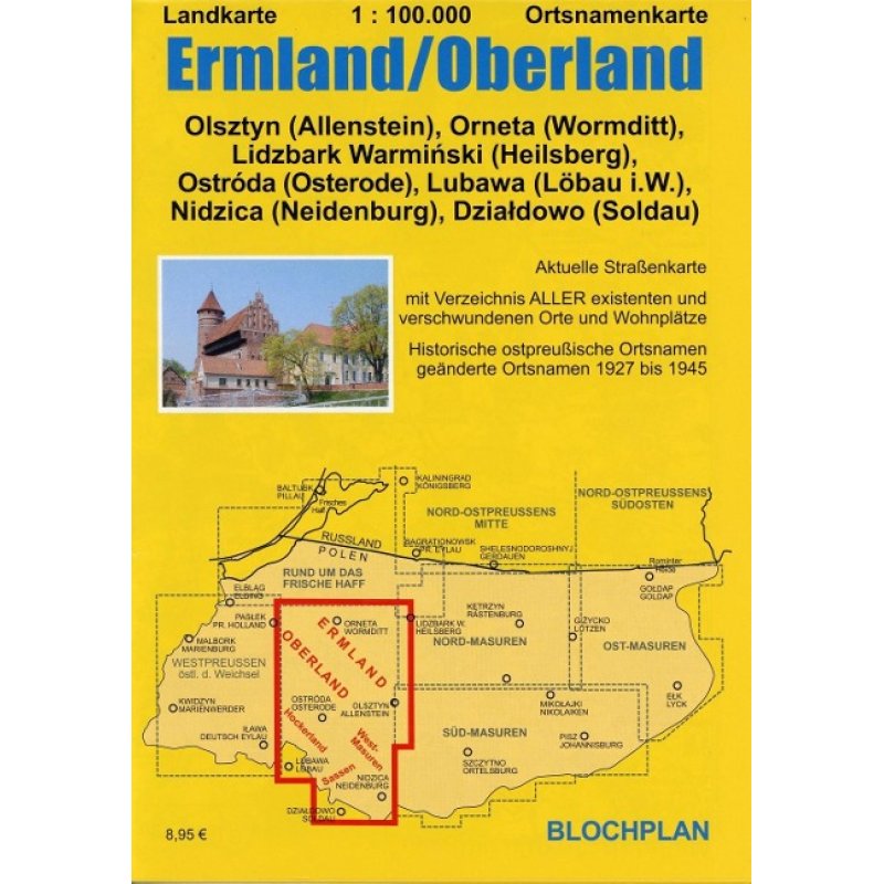 - Die Karte stellt den zentralen Teil der heutigen Woiwodschaft Ermland-Masuren in Ostpreußen dar - den Bereich zwischen den Städten Olsztyn (Allenstein), Orneta (Wormditt), Lidzbark Warminski (Heilsberg), Ostróda (Osterode), Lubawa (Löbau in Westpreußen), Nidzica (Neidenburg) und Dzialdowo (Soldau). Neben dem Großteil des historischen Ermlands mit seiner Hauptstadt Allenstein sind der größte Teil der Landschaft "Oberland", die Westspitze Masurens und die Landschaften "Hockerland" und "Sassen" dargestellt, die heute auf polnisch alle unter dem Namen West-Masuren (Mazury zachodnie) zusammengefasst werden. Der detaillierte Maßstab 1:100.000 erlaubt ALLE in diesem Gebiet vor 1945 vorhandenen Ortschaften und Wohnplätze mit ihren polnischen und deutschen Namen (darunter auch eine Vielzahl von Orten, deren Name in den 30er Jahren verändert wurde) neben den Sehenswürdigkeiten dieser touristisch interessanten Gegend zu verzeichnen. Die boomende Woiwodschaftshauptstadt Allenstein/Olsztyn ist mit ihrem westlichen Umfeld am Übergang zur Nachbarkarte (Süd-Masuren) dargestellt. Die jahrhundertealte am Fluss Passarge verlaufende Grenze zwischen dem Ermland und dem Oberland bzw. dem Hockerland teilt die Karte diagonal. Der hoch gelegene Teil des Oberländischen Kanals zwischen Maldeuten (Maldity) und Osterode ist verzeichnet, die bekannten "Rollberge" liegen westlich des Kartenausschnittes. Die Herderstadt Mohrungen (Morag), die Schlösser der Adelsfamilien Dohna und Dönhoff Schlobitten und Quittainen, das bekannte Schloss von Karnitten, die Stätten der Schlachten von 1410 und 1914 bei Tannenberg, Grunwald und Hohenstein (Olsztynek), Wallfahrtskirchen aber auch viele kleine zu entdeckende lauschige Orte an romantischen Seen zeichnen diese an touristischen Sehenswürdigkeiten reiche Landschaft aus. Zur besseren Orientierung sind neben den Straßen und befahrbaren Wegen noch die aktuellen aber auch die stillgelegten und abgebauten Eisenbahnstrecken und die Kreisgrenzen von 1937 dargestellt. Ein aktueller Innenstadtplan von Allenstein/Olsztyn im Maßstab 1:15.000 enthält außerdem noch die (deutschen) Straßennamen aus der Zeit um 1926 (bzw. 1940 in später erbauten Randbereichen). Auf der Rückseite enthält die Karte Ortsverzeichnisse in Deutsch-Polnisch und Polnisch-Deutsch.