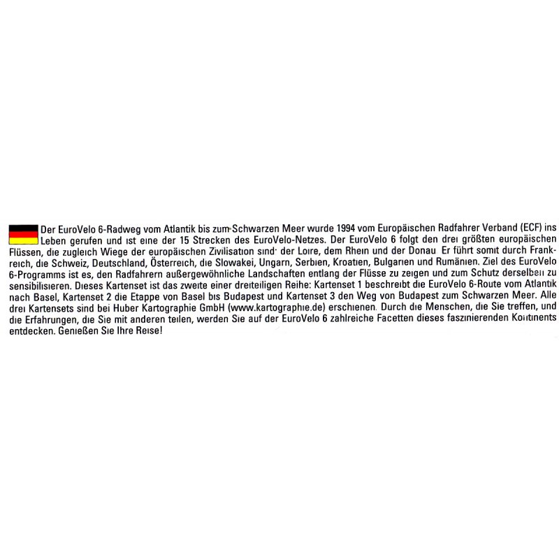Die EuroVelo 6 ist zur Zeit die erste und einzige EuroVelo-Route, die vollständig im Maßstab 1:100 000 innerhalb einer Radkarten-Serie verfügbar ist. Die handlichen Karten folgen dem Verlauf der Route in 3 Sets auf 24 Kartenblättern mit insgesamt 42 Metern Länge.