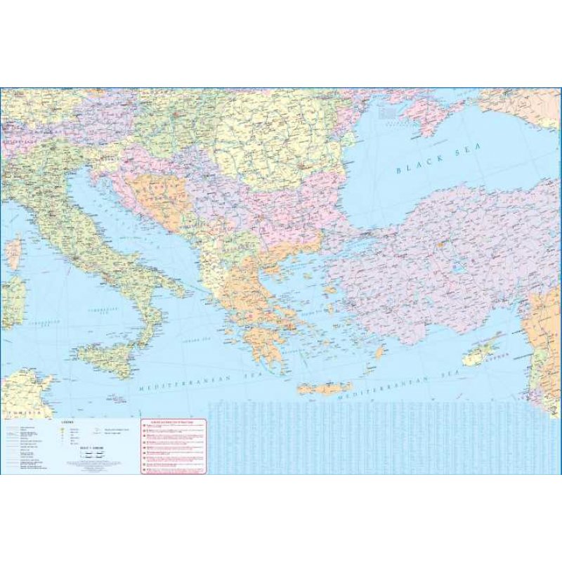 Description by ITMB: ITMB is pleased to announce the release of the final regional map covering Europe at an enhanced scale. Europe may be small in comparison to Canada, but it is densely populated and difficult to map as a continent while providing detail. Eastern Europe used to be defined as everything behind the Iron Curtain during the Cold War, but now it encompasses everything east of Germany and Switzerland, which means that this map covers Italy, Greece and the Balkan countries, the Central European countries of Romania and Hungary and most of Ukraine, Poland and the three Baltic states, and western Russia as far east as Volgograd, as well as much of Turkey. It is a combined road and rail map, showing motorways and major highways, fast-train routes in red and regular services in black. It also shows major cruise line routes, although many have been suspended due to Covid and political situations in Russia and Turkey. Essentially, this is a map covering a very large area, as are our maps of Western and Central Europe, and our earlier map of Scandinavia. We have tried to make it politically correct, which is difficult considering the Russian occupation of Crimea and the Donetsk region of Ukraine and the on-going controversy over the ‘proper’ name for Macedonia, so we apologize for any errors. For simplicity’s sake, we have named most place names in English, so Roma is Rome and Moscva is Moscow etc. Fortunately, most English place names are the same in the local languages. However, being ITMB, Naples is Napoli, and Florence is Firenze, so don’t be too critical of us; we’re trying to reconcile differing perspectives.