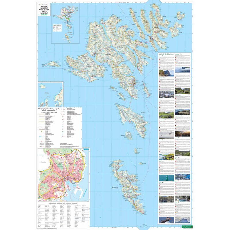 Auf der Kartenrückseite sind die wichtigsten Sehenswürdigkeiten der Färöer Inseln kurz beschrieben. (Sprachen: Deutsch, Englisch).