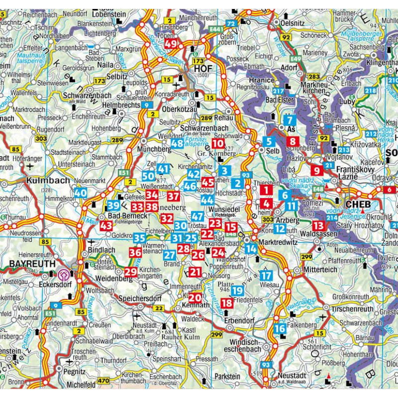 Viel Ursprünglichkeit und unverbaute Schönheit hat sich der Naturpark Fichtelgebirge als ehemaliges bayerisches Grenzland bis heute bewahrt. Das kommt den Wanderern zugute: Die Wanderungen führen durch weite Fichtenwälder, über Granitberge mit Blockmeeren und Felstürmen und vorbei an Mooren und Sümpfen. Herrliche Ausblicke auf diesen Naturschatz hat man von den zahlreichen Aussichtstürmen. Burgen und Schlösser finden sich zahlreich im Fichtelgebirge und sind das Highlight von mancher Wanderung. Sehenswert sind Städte wie Bayreuth, Marktredwitz und Wunsiedel, die Porzellanstädte Arzberg und Selb und viele weitere hübsche Ortschaften, durch die es bei einigen der Wanderungen geht.