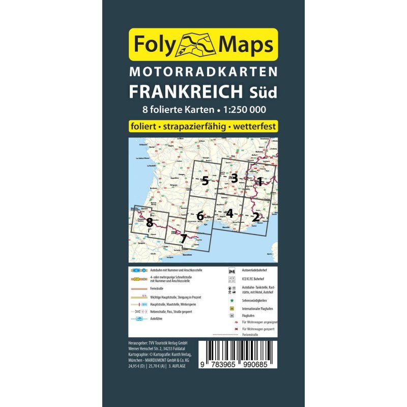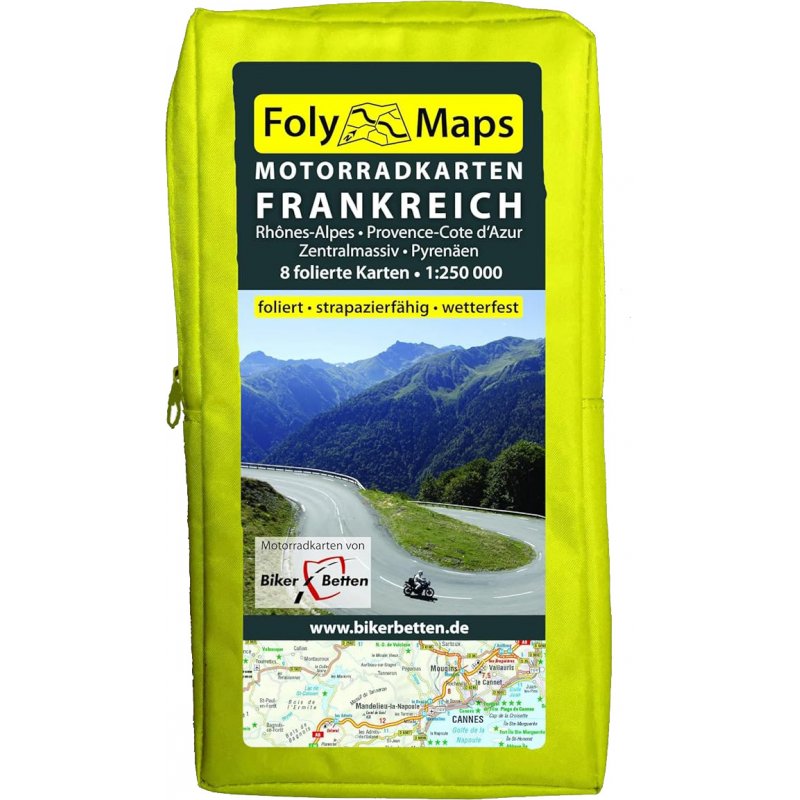 Das FOLYMAPS Motorradkarten-Set Frankreich Süd besteht aus insgesamt acht laminierten Tourenkarten, die im perfekten Tourenmaßstab 1:250.000 die schönsten Motorradregionen im Süden Frankreichs abdecken.