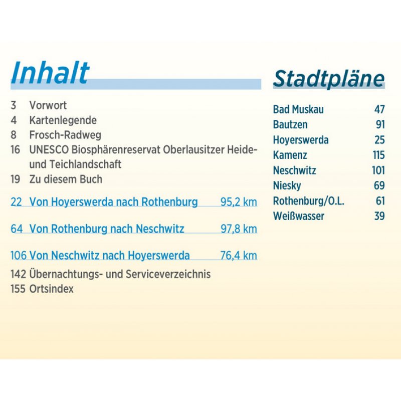 Der Frosch-Radweg ist ein 274 Kilometer langer Rundweg. Er führt durch die reizvolle Oberlausitzer Heide- und Teichlandschaft, die im Nordosten des Landes Sachsens liegt. Hier ist die Heimat der Sorben, jener nationalen Minderheit, die als Nachfahren der Milzener bereits seit dem 4. Jahrhundert in der Lausitz leben. Ihre Sprache und Kultur sind bis heute lebendig und Sie begegnen ihnen auf der Tour immer wieder auf vielfältige Weise. Die Landschaft wird geprägt von den zahlreichen Teichgebieten, die im 13./14. Jahrhundert von adeligen Grundherren in sumpfigen Niederungen und Senken angelegt worden sind. Seither gehört die Teichwirtschaft zu den wichtigsten Erwerbszweigen in der Oberlausitz. Traditionell wird Karpfen gezüchtet. Höhepunkt der Saison ist das große Abfischen im Herbst. Dann kommt der Karpfen nach einem der vielen leckeren Fischrezepte frisch zubereitet auf den Tisch. Das Abfischen wird von den "Lausitzer Fischwochen" begleitet, ein buntes Programm unterschiedlichster Veranstaltungen rund um das Thema "Fisch".