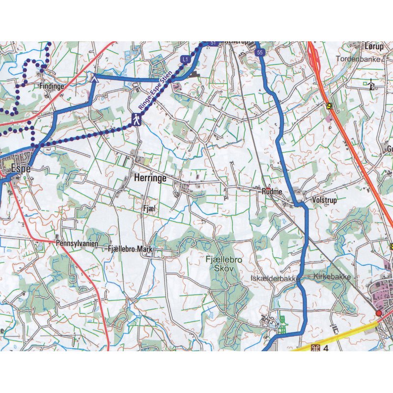 Lokale Fahrradrouten L1 Ringe-Korinth, L2 Odense Å, L3 Langesøstien, L4 Tietgen, L5 Blangsted, L6 Hestehave, L7 Bellinge, L8 Søhus, L9 Stige, L10 Ryds Å, und L11 Næsby