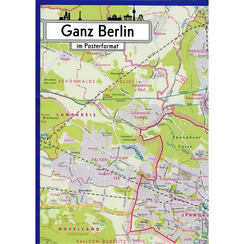 Plan vom gesamten Berlin Stadtgebiet im Maßstab 1 : 63 500. Kartenformat 84 x 59 cm. Rückseite unbedruckt. Ebenfalls noch im Kartenbereich: Potsdamer Innenstadt mit Park Sanssouci, Flughafen BER und Berliner Umland. Mit S- und U-Bahnnetzplan. Betonung der Berliner Ortsteil- und Bezirksnamen und -grenzen. Betonung der S- und U-Bahn und ihrer Bahnhofsnamen. Straßenbahnlinien. Stadtstruktur mit allen Straßen, davon die wichtigsten Hauptstraßen mit Namen bezeichnet. Wohn- und Gewerbegebiete farblich unterschieden. Eintrag vieler Ortslagen und Siedlungen sowie Gewässer, Wälder und Landmarken. Höhenangaben der natürlichen und künstlichen Erhebungen.