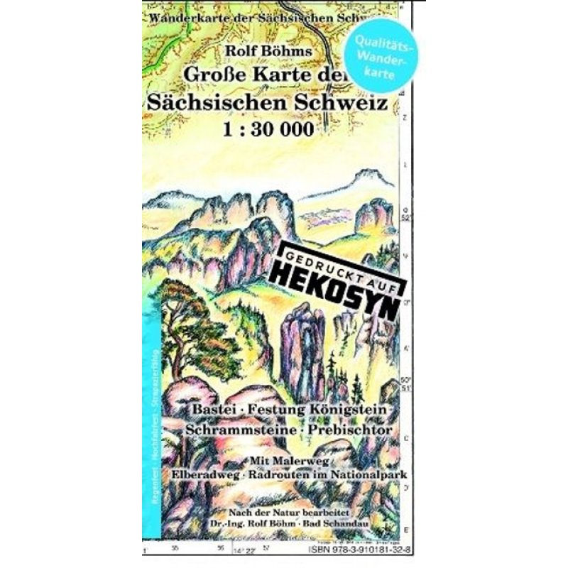 *Gedruckt auf einen wetterfesten, hochfalzfesten Bedruckstoff in Papieranmutung. Mit der Herausgabe dieser Karte unter der Markenbezeichnung "Gedruckt auf Hekosyn" läßt Böhm eine Tradition des VEB Touristverlag Berlin wieder aufleben, der vor 40 Jahren Wanderkarten auf das hochstabile DDR-Synthesefaserpapier Hekosyn gedruckt hat. Böhm nutzt SIHL Enduro Classic 100 L als Bedruckstoff. Der Karte kann kein Wetter etwas anhaben.