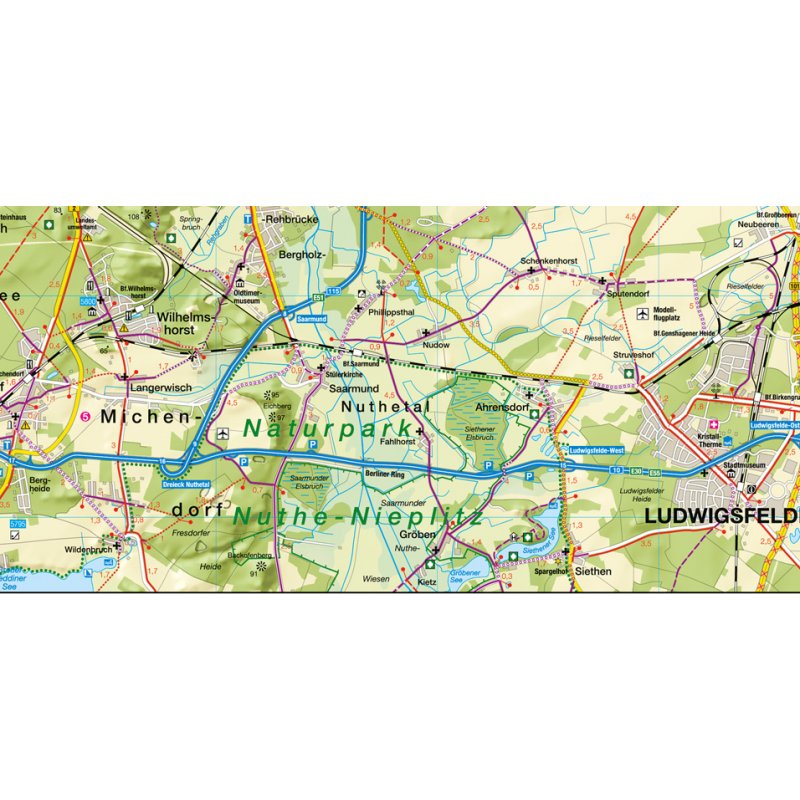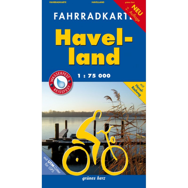 Das Havelland steht mit den Städten Potsdam und Brandenburg an der Havel im Mittelpunkt dieser speziellen Fahrradkarte (M 1:75.000). Solch bekannte Orte wie Berlin Spandau, Falkensee, Havelsee, Henningsdorf, Ketzin, Kloster Lehnin, Nauen, Rathenow, Teltow und Werder (Havel) finden sich auf ihr wieder. Die topographische Karte enthält das regionale Radwege- und Radroutennetz mit Angaben zu Markierung, Oberflächen und Entfernungen. Der Verlauf der durch die Region führenden Radfernwege wurde besonders hervorgehoben. Die Karte weist auf Abschnitte hin, an denen sich eine gemeinsame Nutzung mit einem stärkeren Kfz-Verkehr nicht vermeiden lässt bzw. welche abzuraten sind. Lohnenswerte touristische Ziele und Sehenswürdigkeiten sind durch Symbole gekennzeichnet und beschriftet. Der farbig bebilderte Rückseitentext beschreibt die touristisch interessanten Orte und gibt Tourentipps. Die Karte wurde auf wasser- und reißfestem sowie recyclingfähigem Material gedruckt.