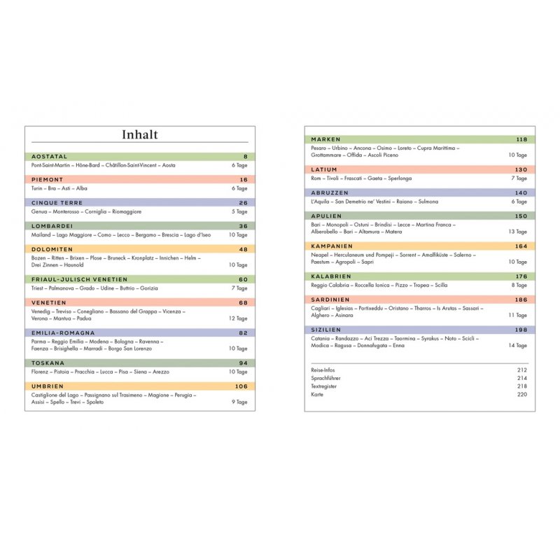 Ob 5 Tage oder 2 Wochen, ob in den Bergen oder am Meer, ob quer durch die Abruzzen oder die Lombardei, oder eine Rundreise durch Sizilien, Sardinien oder die Toskana: Umfangreich bebildert, präsentiert Ihnen das Reisebuch "Urlaub mit dem Zug" 18 einzigartige Bahnreisen, die Sie in geschichtsträchtige Städte, in charmante Dörfer oder zu den verborgenen Schätzen Italiens bringen, z.B. 7 Tage Latium mit Rom, Tivoli, Frascati, Gaeta und Sperlonga, 10 Tage Dolomiten mit Bozen, Ritten, Brixen, Plaus, Bruneck, Kronplatz, Innichen, Helm, Drei Zinnen und Haunold oder 13 Tage Apulien mit Bari, Monopoli, Ostuni, Brindisi, Lecce, Martina Franca, Alberobello, Bari, Altamura und Matera.