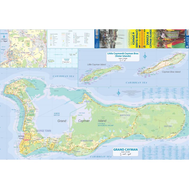 Description by ITMB: This map was called Cayman Islands and Jamaica in its previous edition, which was a well-intentioned attempt to promote the smaller islands adjacent to big brother. Now, we are reverting to what we think is a more logical title arrangement for listing purposes, but the map has two covers, so one can market it as either Jamaica or the Caymans, or best of all, market both! We visited the Caymans a few months ago and drove every road on the main island, including a few that turned out to be driveways! The map is very current as a result. The other side of the map is the very popular touristic island of Jamaica, now into its sixth edition. This island is large enough to justify renting a car and exploring. It is a great way to discover hidden coves and find historic plantations, especially along the touristic north shore.