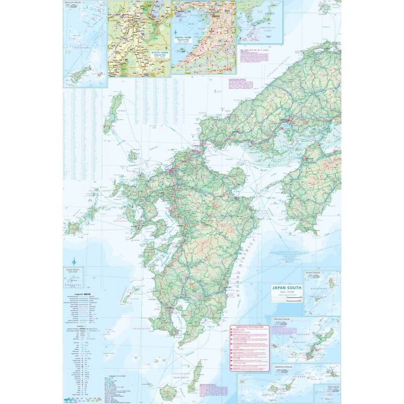 Description by ITMB: Most people travel around Japan by train, so we have re-worked our previous edition of this title into a railway-user-friendly map for all of Japan west of Tokyo. The express Shinkensen lines are coloured differently from the local lines, which are still quite nice and generally are more scenic. We show the road network in excellent detail as well. Naturally, well-known travel spots such as Kyoto and Hiroshima are shown, but western Japan has much more to offer. Nagano, north of Tokyo, or Nagano, to the west, are both now on Shinkensen routes. So is Kagoshima in the far southwest, and from there local lines wend south and east to little-visited parts of Japan. The map, printed on plastic for durability includes insets of Kyoto, Osaka, and Tokyo, as well as island insets of Okinawa and related islands.