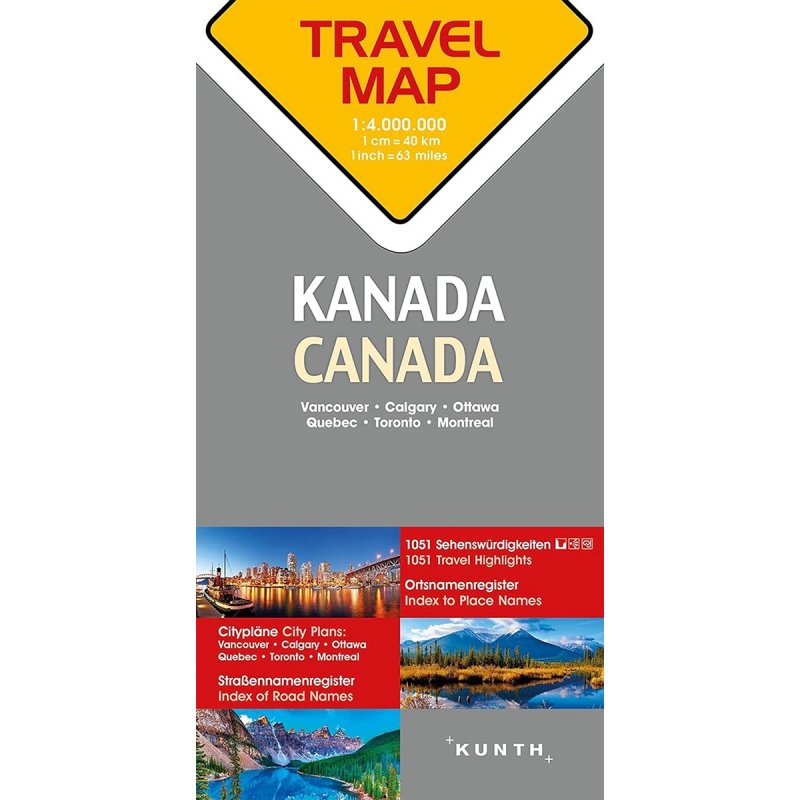 Die beidseitig bedruckte Reisekarte beinhaltet eine Landkarte für Kanada, Stadtpläne für Vancouver, Calgary, Ottawa, Quebec, Toronto und Montreal, Ballungsraumkarten für Vancouver, Toronto und Montréal sowie eine Sonderkarte für Niagara Falls.