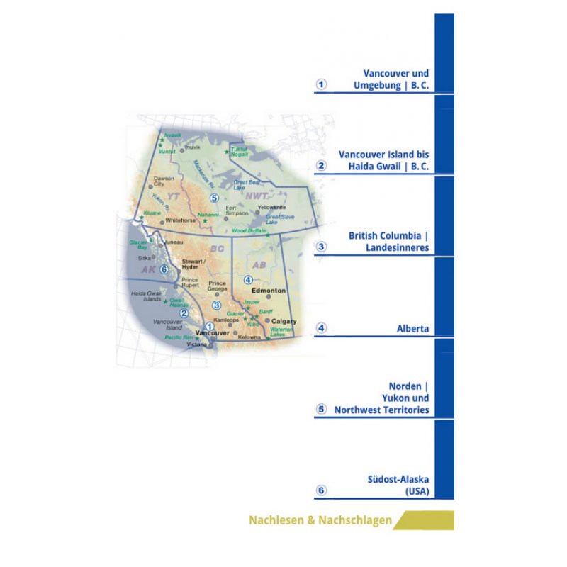Kanada und Südost-Alaska in der Übersicht: Die lebenswerte, pulsierende Metropole Vancouver mit Umgebung - übrigens südlicher gelegen als Berlin. Naturparadies Vancouver Island, die Fährpassagen vor British Columbia und die Haida-Gwaii-Inseln. Hochalpine Bergwelten und Kanadas einzige Wüste im Landesinneren von British Columbia. Rocky Mountains und Columbia Mountains, South Central B.C., die Cariboo-Chilcotin-Region und der Norden British Columbias. Alberta mit Calgary und Edmonton. Roadtrips auf den Spuren der Goldsucher im kanadischen Norden erschließen den Yukon und die Northwest Territories mit Dawson City bis hinauf zum Polarkreis. Schließlich zeigt der Kanada-Reiseführer noch Südost-Alaska mit der Hauptroute durch die Inside Passage vorbei an Juneau und Wrangell, mit Glacier Bay National Park, Prince of Wales Island und weiteren lohnenden Zielen. Die Hauptstadt Kanadas, Ottawa, liegt in der östlichen Provinz Ontario.