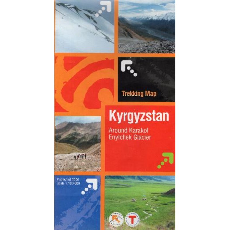 Große doppelseitige topographische Trekkingkarte von Kirgisien auf der Grundlage der russischen Militärkarte. Kyrillische Ortsnamen und Landschaftsbezeichnungen sind durch lateinische Versionen ersetzt. Die beiden Kartenteile grenzen nicht unmittelbar aneinander.