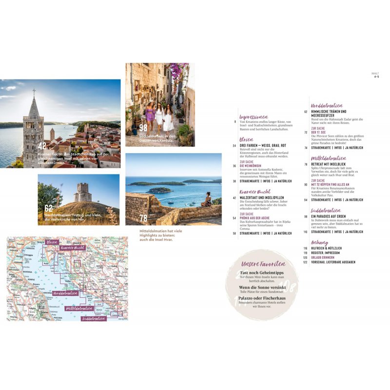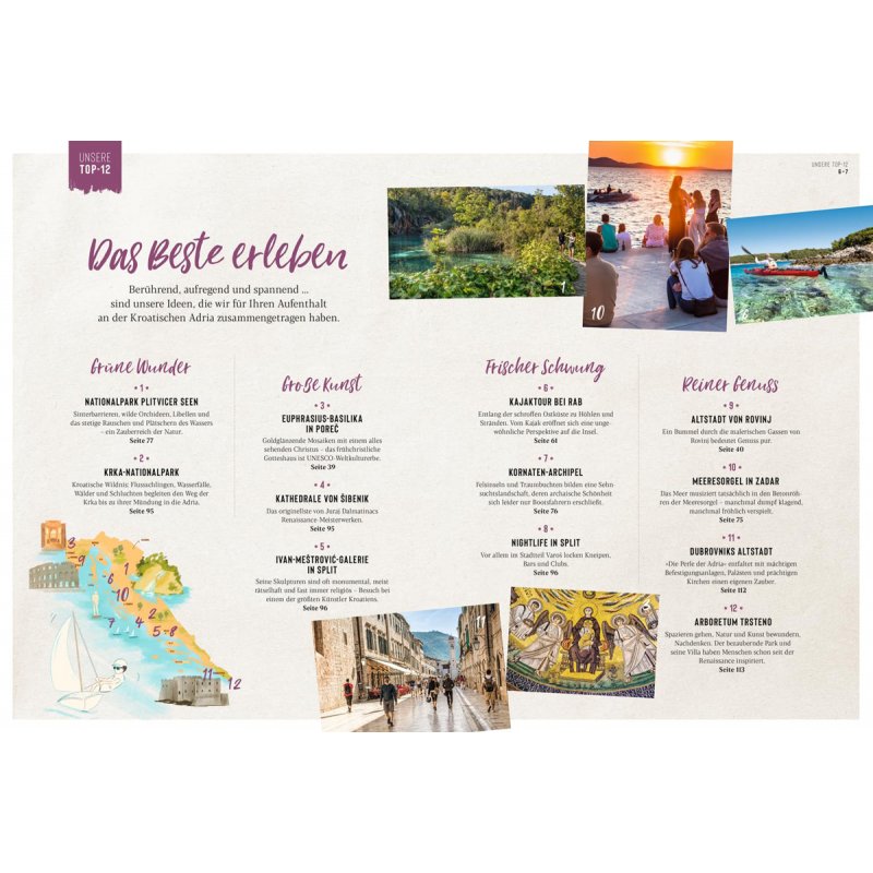 ... mit einer rund 1800 km langen Küste und mehr als 1200 Inseln. Der DUMONT Bildatlas beschreibt die gesamte Kroatische Adriaküste von Istrien bis Süddalmatien und gibt viele Tipps für besonders schöne Badebuchten, für kurze Kreuzfahrten oder meditative Tage am Meer. Wir empfehlen reizvolle Miniinseln, wo man einmal ganz abtauchen und den Alltag vergessen kann. Die Rubrik "Zur Sache" beschäftigt sich dagegen mit Hintergrundinfos zur Küste. Ein Artikel widmet sich dem Thema "Naturschutz contra Tourismus" und macht klar, dass die Kroatische Küste ein bedrohtes Paradies ist. Ein anderer Rijeka. Die Kulturhauptstadt 2020 hat Daniela Schetar vor und nach dem Kulturhauptstadtjahr besucht, dort warten neue Entdeckungen.
