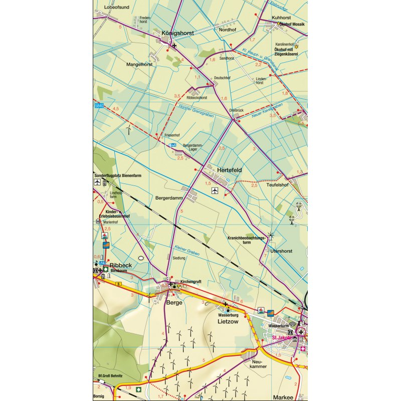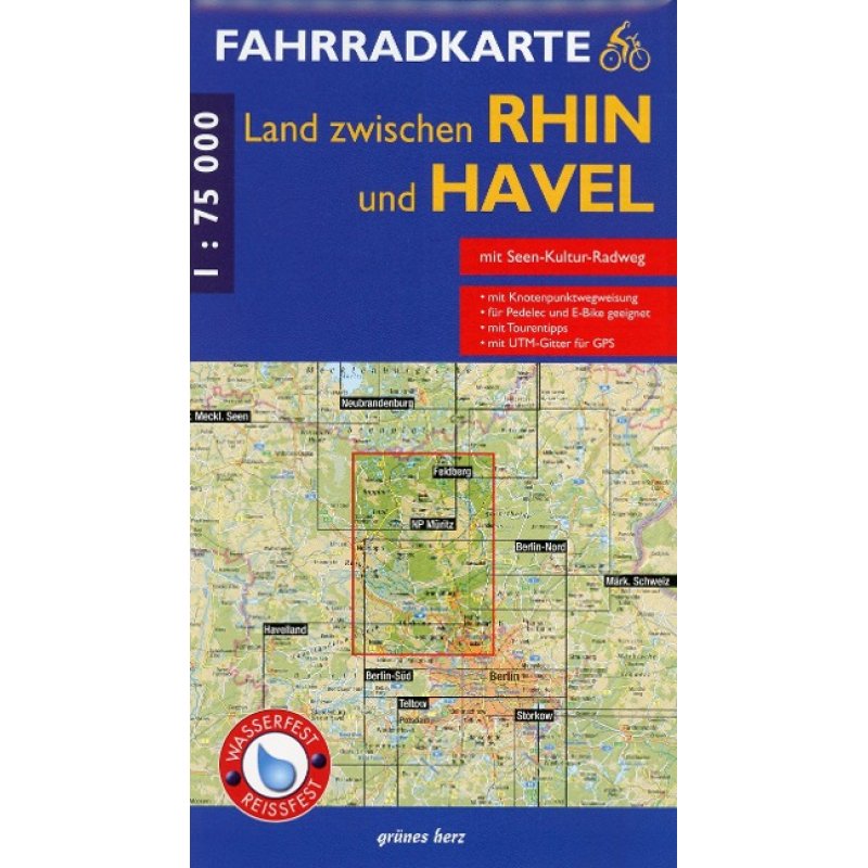 Das Gebiet rund um den Seen- und Kultur-Radweg bildet das Zentrum dieser speziellen Fahrradkarte (M 1:75.000). Solch bekannte Orte wie Fehrbellin, Fürstenberg/Havel, Gransee, Henningsdorf, Lindow (Mark), Nauen, Neuruppin, Oranienburg, Rheinsberg und Zehdenick finden sich auf ihr wieder. Die topographische Karte enthält das regionale Radwege- und Radroutennetz mit Angaben zu Markierung, Oberflächen und Entfernungen. Der Verlauf der durch die Region führenden Radfernwege wurde besonders hervorgehoben. Die Karte weist auf Abschnitte hin, an denen sich eine gemeinsame Nutzung mit einem stärkeren Kfz-Verkehr nicht vermeiden lässt bzw. welche abzuraten sind. Lohnenswerte touristische Ziele und Sehenswürdigkeiten sind durch Symbole gekennzeichnet und beschriftet. Der farbig bebilderte Rückseitentext beschreibt die touristisch interessanten Orte und gibt Tourentipps. Die Karte wurde auf wasser- und reißfestem sowie recyclingfähigem Material gedruckt.