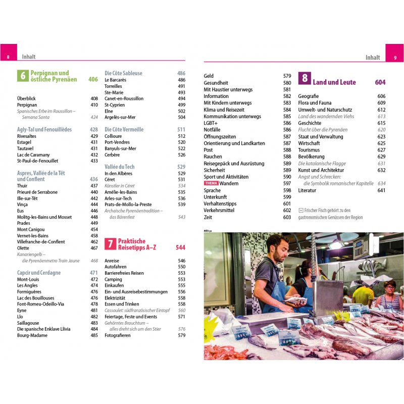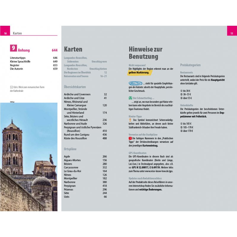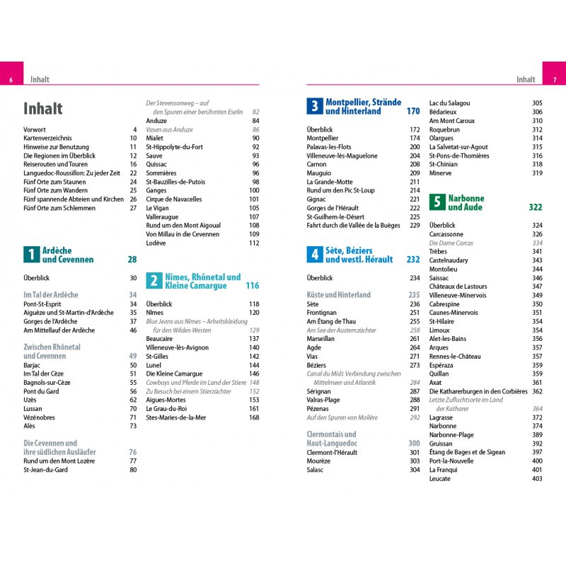 - Übersichtsseiten mit den bedeutendsten Regionen im Überblick: Ardèche und Cevennen, Nîmes, Rhônetal und Kleine Camargue, Montpellier, Strände und Hinterland, Sète, Béziers und westliches Hérault, Narbonne und Aude sowie Perpignan und östliche Pyrenäen