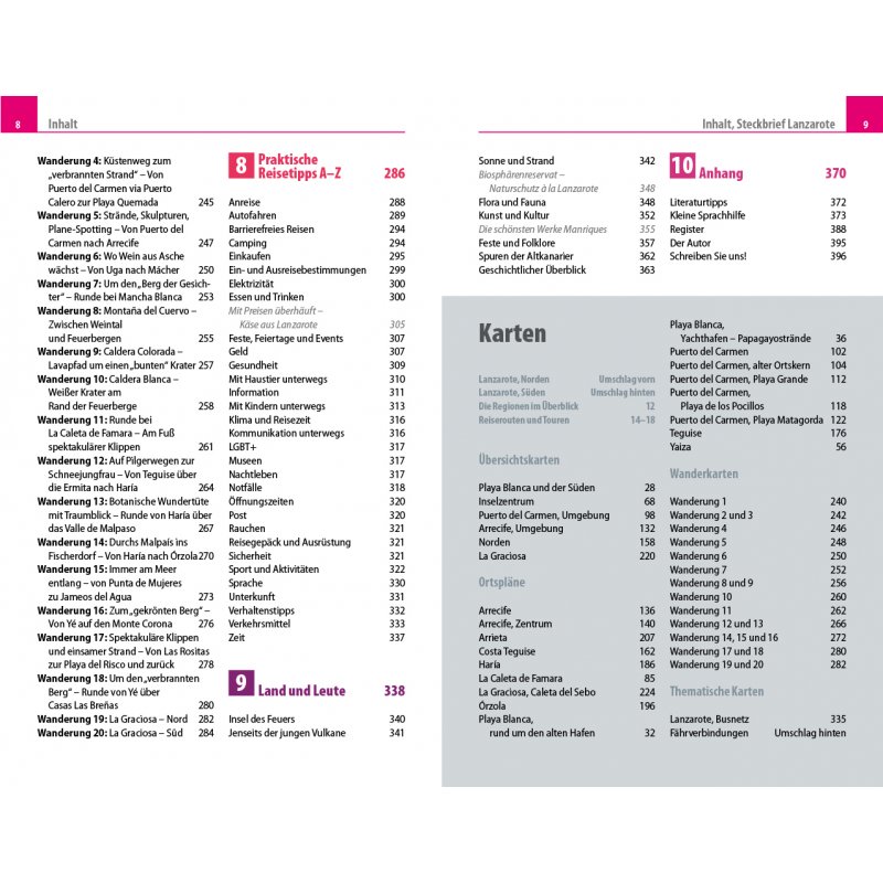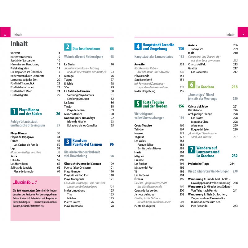 - Übersichtsseiten mit den bedeutendsten Regionen der Insel: Playa Blanca und der Süden, das Inselzentrum, Puerto del Carmen, Arrecife und Umgebung, Costa Teguise und der Norden sowie La Graciosa