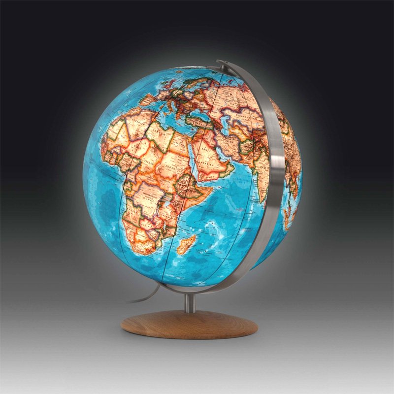 Über 2.000 geografische Namen sind auf diesem handkaschierten Leuchtglobus verzeichnet. Der Text ist übersichtlich und jedes Land in einer anderen Farbe dargestellt, mit einem dunkleren Farbton an den Grenzen, um die politische Karte stärker hervorzuheben. In den Ozeanen sind unterseeische Gräben und Becken bezeichnet. Rote und blaue Pfeile kennzeichnen die wichtigsten warmen und kalten Meeresströmungen. Unterschiedliche Blautöne lassen die Meerestiefen erkennen, Schattierungen kennzeichnen die Gebirgszüge auf den Landmassen.