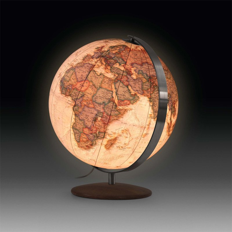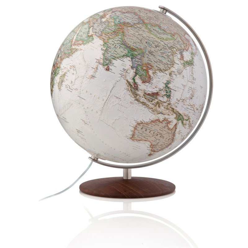 Über 2.000 geografische Namen sind auf diesem handkaschierten Leuchtglobus verzeichnet. Die preisgekrönte Kartographie von National Geographic verbindet ein klassisches Antikdesign-Kartenbild mit einer aktuellen politischen Darstellung. Der Text ist übersichtlich und jedes Land in einer anderen Farbe dargestellt, mit einem dunkleren Farbton an den Grenzen, um die politische Karte stärker hervorzuheben. Es werden warmen Erdfarbtöne verwendet und ein klares Schriftbild verbessert die Lesbarkeit. Schattierungen kennzeichnen sowohl Gebirgszüge auf den Landmassen, als auch das unterseeische Relief.